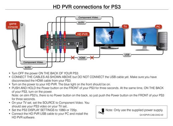 Note: Before connecting your PS3 to the HD PVR or Colossus, connect it to your HD TV set to make the changes to the PS3 video modes settings. By default, the PS3 will be set to 1080p and HD PVR and Colossus will not work with this resolution. You will need to change your PS3 360 to 480p, 720p, or 1080i.